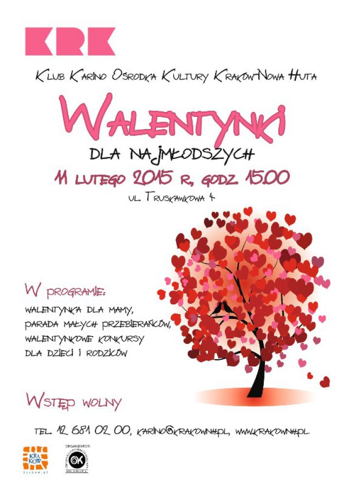 Klub Karino Orodka Kultury Krakw-Nowa Huta (ul. Truskawkowa 4) zaprasza 11 lutego 2015 r. o godz. 15.00 na niezapomniane zabawy walentynkowe. Dla mam z maymi dziemi Klub przygotowa wyjtkowe spotkanie. W programie znajd si walentynka dla mam, parada maych przebieracw oraz liczne walentynkowe konkursy dla dzieci i mam.