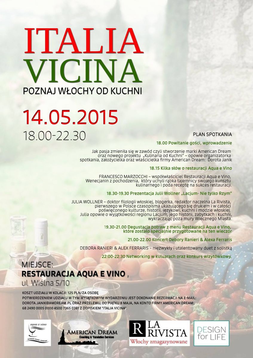 Firma American Dream wraz z Restauracjš „Aqua e Vino” serdecznie zapraszajš na ucztę dla zmysłów. Będzie to wyjštkowa okazja, aby poznać kulinarne tajemnice Włoch i zasmakować specjałów szefa kuchni najlepszej restauracji w kategorii kuchnia włoska według rankingu Dziennika Polskiego za rok 2014.