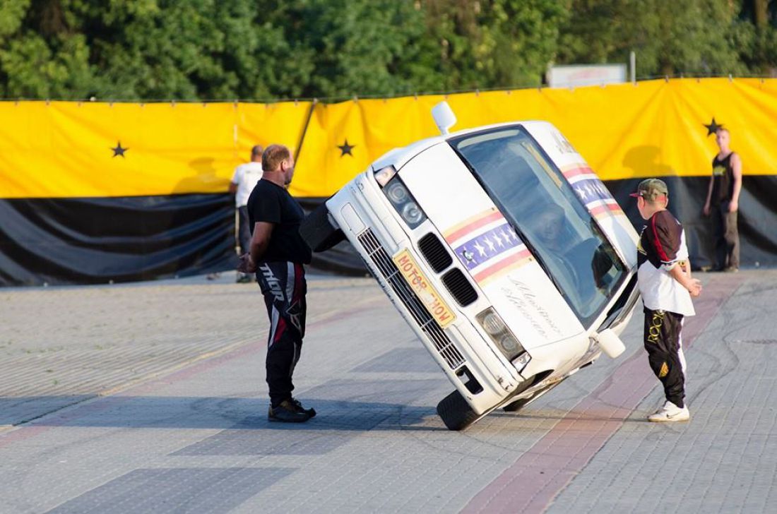 * przejazd przez cianę ognia z człowiekiem na masce pojazdu;