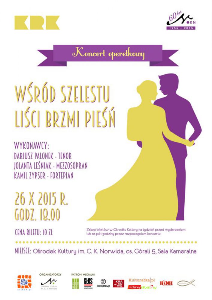 Koncert odbędzie się 26 paŸdziernika 2015 r., o godz. 18.00 w Sali Kameralnej Oœrodka Kultury im. C. K. Norwida, os. Górali 5. Bilety w cenie 10 zł będš dostępne przed wydarzeniem w Oœrodku Kultury. Serdecznie zapraszamy.