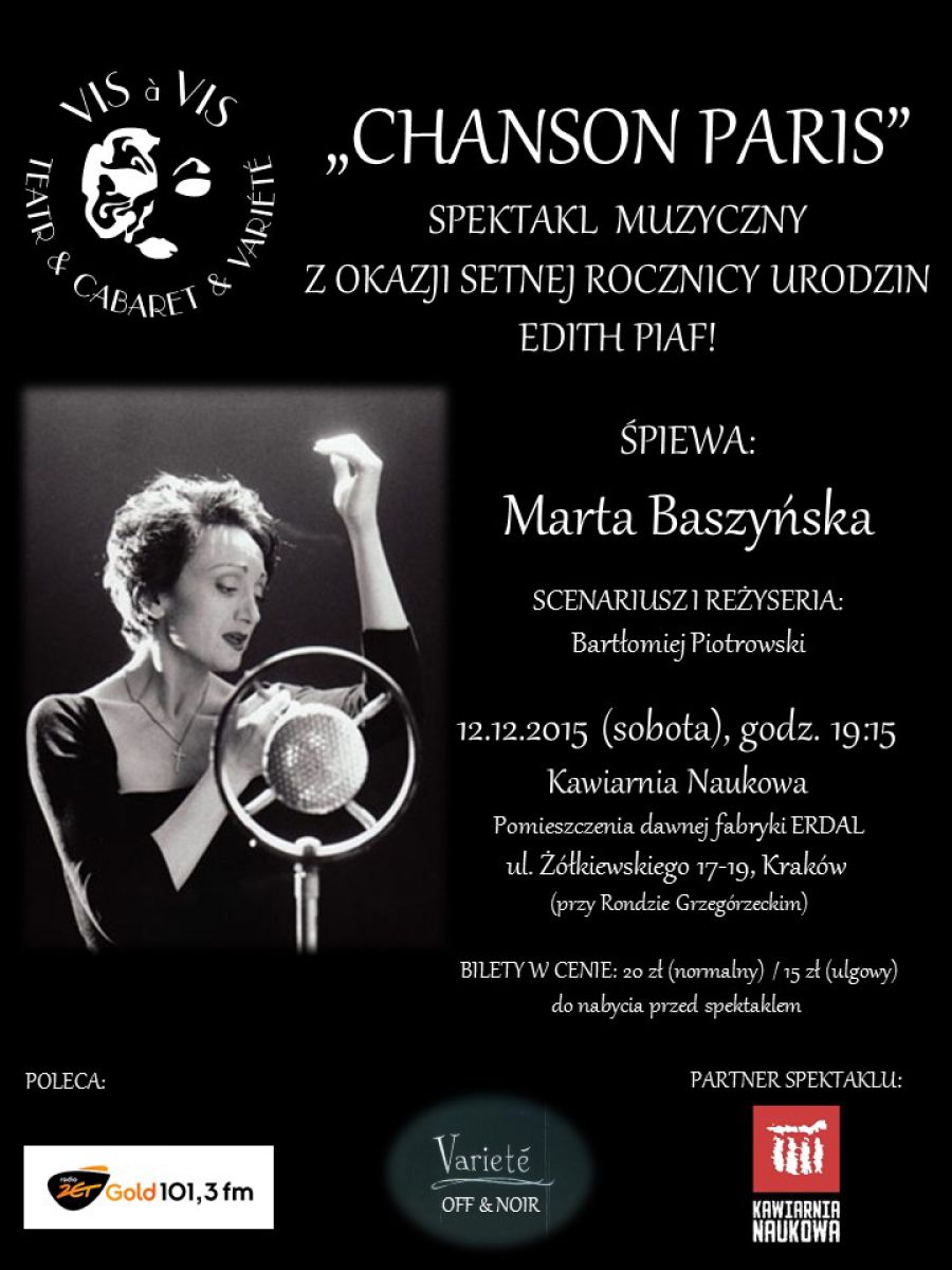 W wyjštkowym programie CHANSON PARIS - najpiękniejsze piosenki Edith Piaf, francuskie szlagiery oraz przeboje Ewy Demarczyk, a także wiersze Jacquesa Preverta i Haliny Powiatowskiej - zapiewa Gwiazda scen muzycznych, artystka Teatru VIS a VIS - Marta Baszyńska.