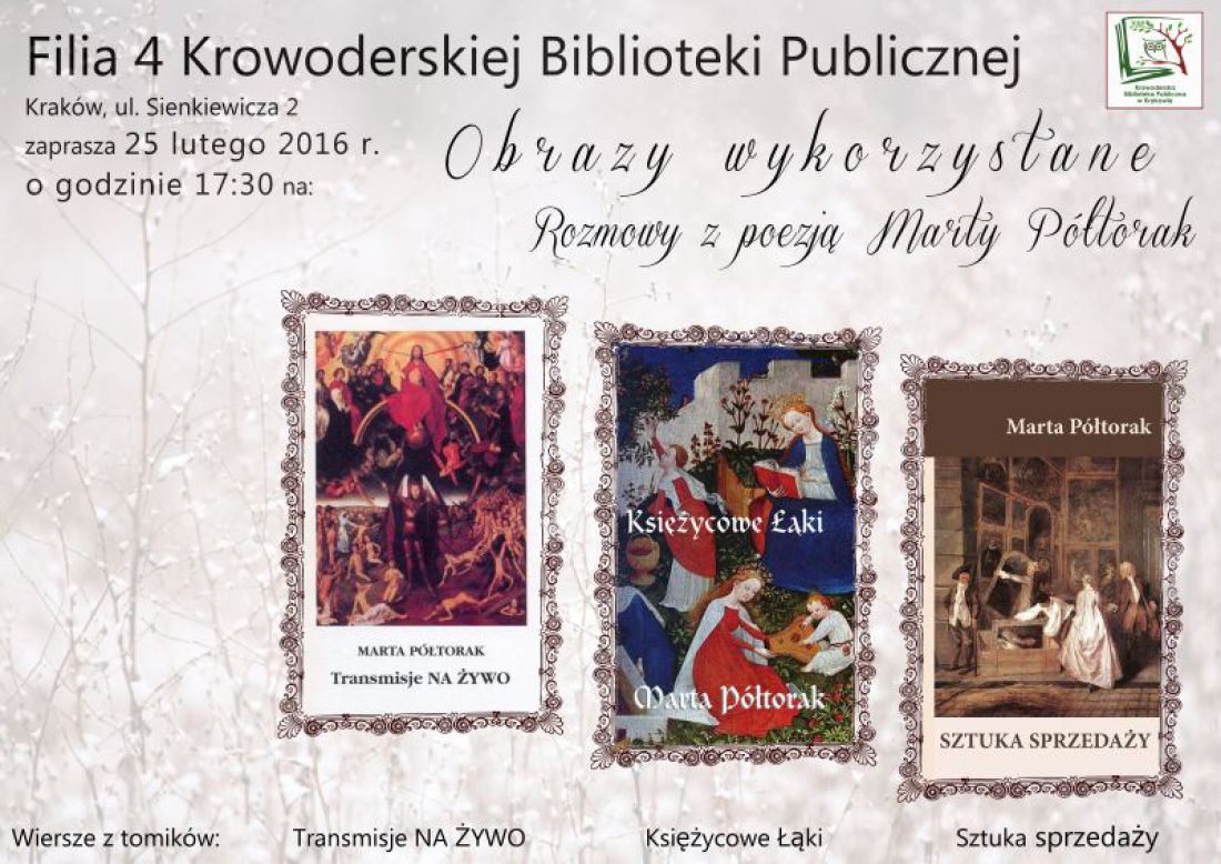 Marta Półtorak rocznik 76. Dziennikarka, poetka, historyk . Jej teksty ukazywały się na łamach : Fragile (2009,2011), LOUNGE Magazine (2009), Frazy (2010), Dziennika Polskiego (2011, 2016), Kwartalnika Stowarzyszenie Pisarzy Polskich za Granicš Ekspresje(2011), KRAKÓW (2011), Lamelli (2010-2016) oraz SYNEKDOCHA (2016) (publikacji pokonkursowej 300 słów o swoim wierszu (2013), ARCANA (2014) oraz w krakowskich almanachach poetyckich w latach 2008 -2015. W lipcu 2009 ukazał się jej debiutancki arkusz poetycki Globalne Zadymy wydany przez ródmiejski Orodek Kultury w Krakowie, a w marcu 2010 pierwszy samodzielny tomik poezji Transmisje NA ŻYWO wydany pod patronatem OK oraz Kwartalnika FRAGILE. Drugi tomik Księżycowe Łški wydała nakładem Wydawnictwa e-Bookowo (2012) wersji papierowej i e-book, podobnie najnowszy tomik Sztuka Sprzedaży (e-Bookowo 2015). Absolwentka Wydziału Humanistycznego Akademii Pedagogicznej w Krakowie na kierunkach : historia i dziennikarstwo. Należy do Stowarzyszenia Dziennikarzy Polskich.