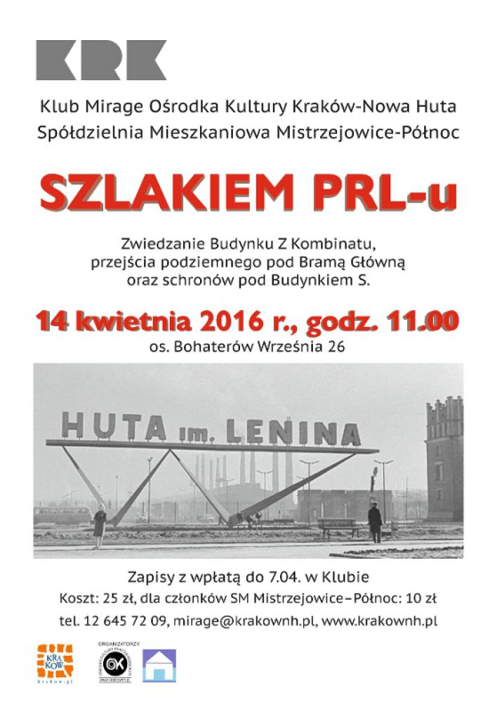 Klub Mirage Orodka Kultury Kraków-Nowa Huta (os. Bohaterów Wrzenia 26) i Spółdzielnia Mieszkaniowa Mistrzejowice-Północ zapraszajš seniorów i dorosłych do zwiedzania Budynku Z oraz przejć podziemnych i schronów pod Budynkiem S. Budynek Z jest niezwykłš architektonicznie budowlš, bogato zdobionš, wzbudzajšcš zachwyt mieszajšcy się z niedowierzaniem, że powstał w czasach PRL-u Schrony przeciwatomowe w Nowej Hucie owiane sš legendš. Na całe szczęcie miejsca te zostały niedawno otwarte dla żšdnych wrażeń zwiedzajšcych. Schron dla dyrekcji huty stali i wojskowych, mieszczšcy się pod kombinatem to prawdziwa podróż w czasie. To trzeba zobaczyć. Zwiedzanie odbędzie się 14 kwietnia o godz. 11.00. Zapisy wraz z wpłatš w Klubie.