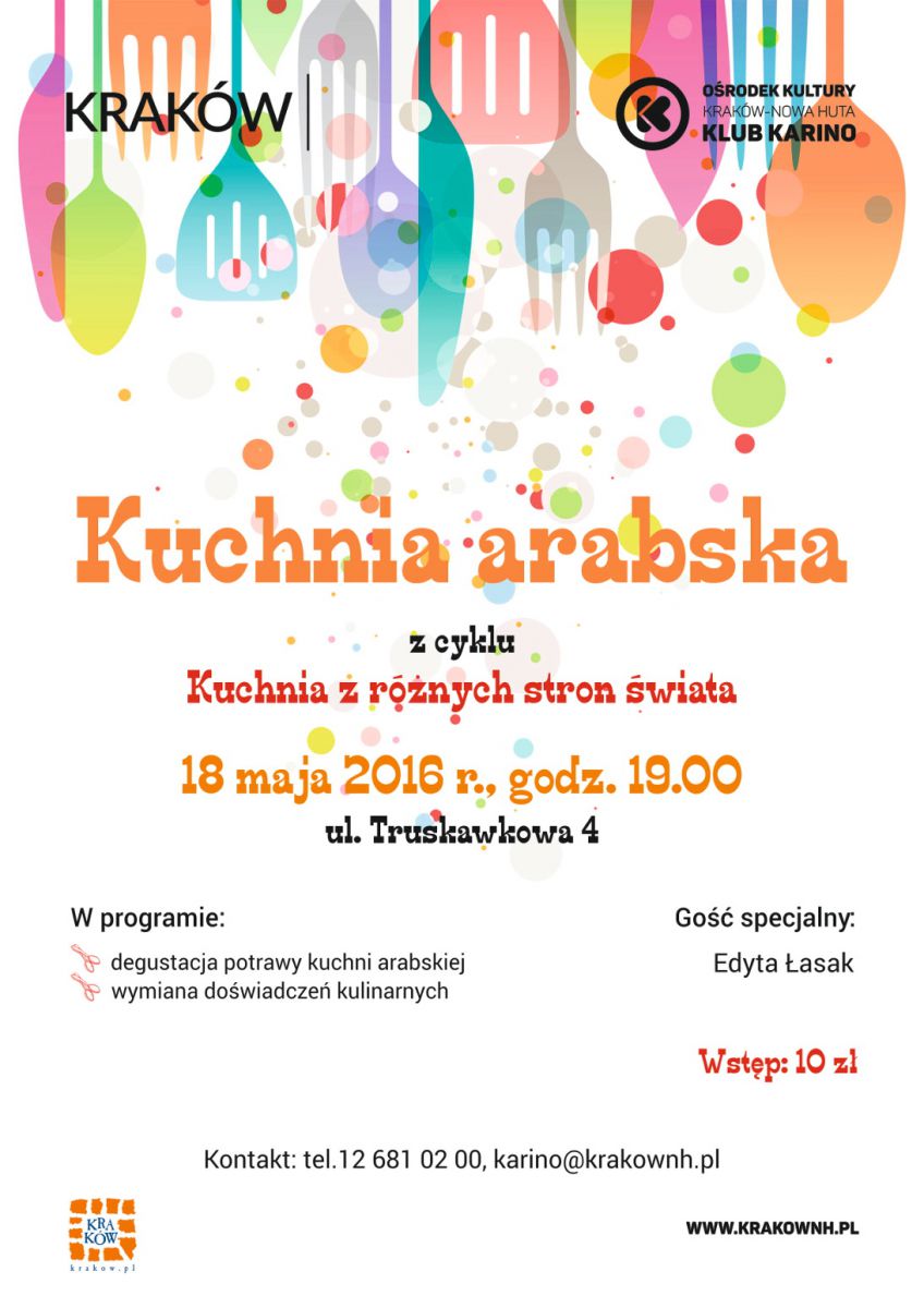 Moda na smaczne i zdrowe gotowanie wkroczyła również do Klubu Karino Orodka Kultury Kraków-Nowa Huta. Spotkania z cyklu Kuchnie z różnych stron wiata odbywajš się raz w miesišcu. Podczas czwartego spotkania, które odbędzie się 18 maja o godz. 19:00 na ul. Truskawkowej 4 prezentowana będzie potrawa kuchni arabskiej. Odbędzie się degustacja i wymiana dowiadczeń kulinarnych uczestniczek spotkania. Gociem specjalnym będzie Pani Edyta, która częć swojego życia spędziła w Bahrajmie, państwie położonym w Azji w Zatoce Perskiej.