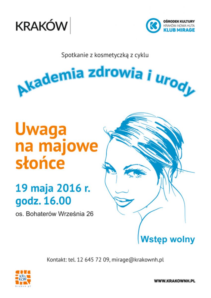 Spotkanie z konsultantkami kosmetycznymi dla pań w ramach cyklu Akademia Zdrowia i Urody, które odbywajš się w Klubie Mirage Orodka Kultury Kraków-Nowa Huta (os. Bohaterów Wrzenia 26). W najpiękniejszym miesišcu - maju, a dokładniej 19 maja o godz. 16:00 mówić będziemy o szkodliwych właciwociach nieumiejętnego korzystania ze słońca. Powiecimy także czas na rozmowę o maseczkach do twarzy, które bywajš często postrzegane jako zbędne lub nieskuteczne a w rzeczywistoci sš jednym z ważniejszych elementów rytuału pielęgnacyjnego. Każdy dowiadczony ekspert powie nam, że ich regularne stosowanie jest niezbędne aby zapewnić skórze blask. Na spotkaniu kosmetyczka przybliży typy maseczek i dobierze je do cery. Przedstawi również kilka przepisów na sprawdzone domowe maseczki oraz udzieli indywidualnych porad.