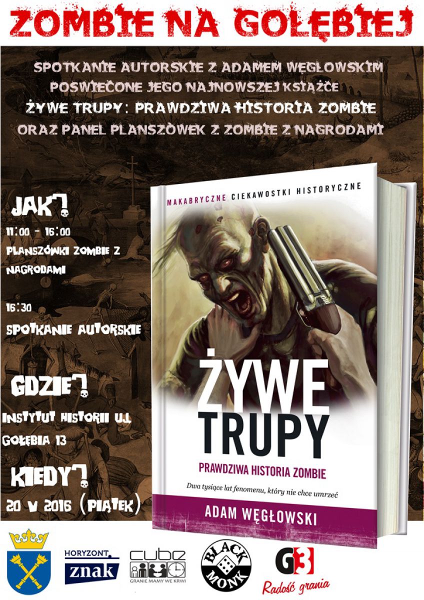 20 maja, o godzinie 16.30, w Collegium Witkowskiego (siedzibie Instytutu Historii UJ - ul. Gołębia 13), odbędzie się spotkanie z Adamem Węgłowskim, poœwięcone jego najnowszej ksišżce "Żywe trupy. Prawdziwa historia zombie". Ponadto, organizatorzy zapraszajš na godzinę 11.00 do wzięcia udziału w grach planszowych o tematyce żywych trupów, pochodzšcych z wydawnictw: Cube - Factory of Ideas, G3 oraz Black Monk Games. Najlepsi gracze otrzymajš nagrody ksišżkowe.