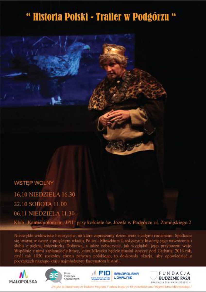 Fundacja Budzenie Pasji zaprasza wszystkich mieszkańców Krakowa i okolic, a zwłaszcza mieszkańców Dzielnicy Podgórze, na niezwykłš przygodę z historiš poczštków państwa polskiego adresowanš do dzieci w wieku 6-10 lat i ich rodzin – rodzeństwa, rodziców oraz dziadków. „Historia Polski – Trailer w Podgórzu” to widowisko sceniczne z udziałem aktorów oraz rekonstruktorów historycznych, które w prosty lecz emocjonujšcy sposób przybliża odległe dzieje roku 966.