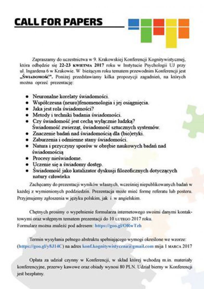 Krakowska Konferencja Kognitywistyczna to wydarzenie organizowane przez członków Koła Naukowego Studentów Kognitywistyki UJ majšce na celu promocję tej interdyscyplinarnej dziedziny. W roku 2017 tematem przewodnim 9 edycji konferencji będzie œwiadomoœć.