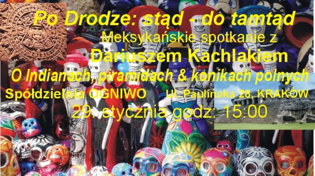 Meksyk: kraj kontrastów, niezwykłych kolorów, rozmaitych języków, pięknych ludzi, bezkresnych Dróg, pieczonych koników polnych, chilli i limonek. Meksyk to stan umysłu, do którego zapraszam Was w niedzielne popołudnie, 29. stycznia 2017 o godz. 15:00 do Spółdzielni Ogniwo w Krakowie, przy ul. Paulińskiej 28.