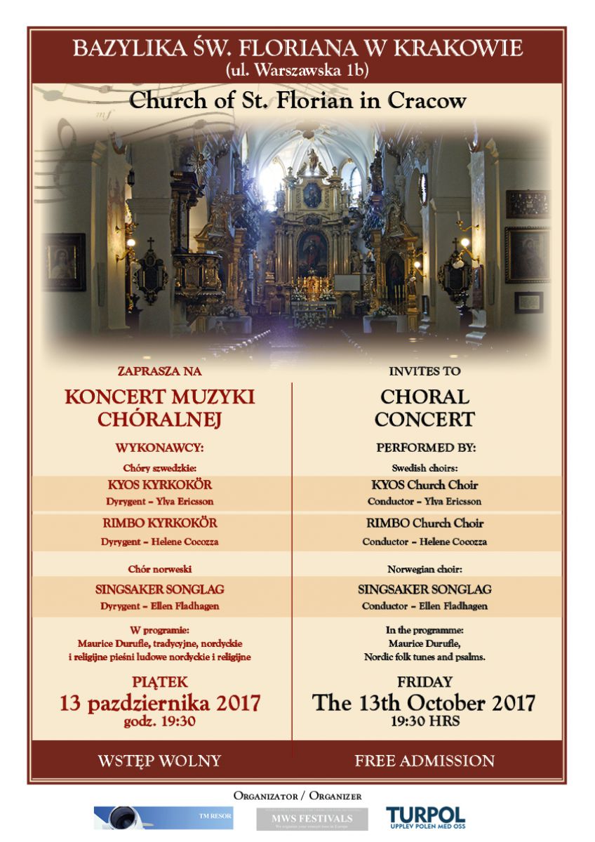 Koncert chórów: Kyos kyrkokör i Rimbo kyrkokör ze Szwecji oraz chóru Singsaker Songlag z Norwegii w Bazylice w. Floriana w Krakowie.