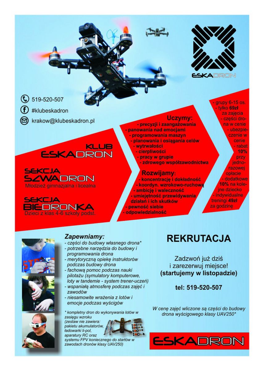 Miłonicy dronów majš powód do radoci w Krakowie ruszajš warsztaty budowy i nauki pilotowania tych maszyn. Klub EskaDron zaprasza na zajęcia z obsługi dronów wycigowych klasy 250. Warsztaty obejmujš budowę własnego drona wycigowego oraz naukę bezpiecznego lotu.