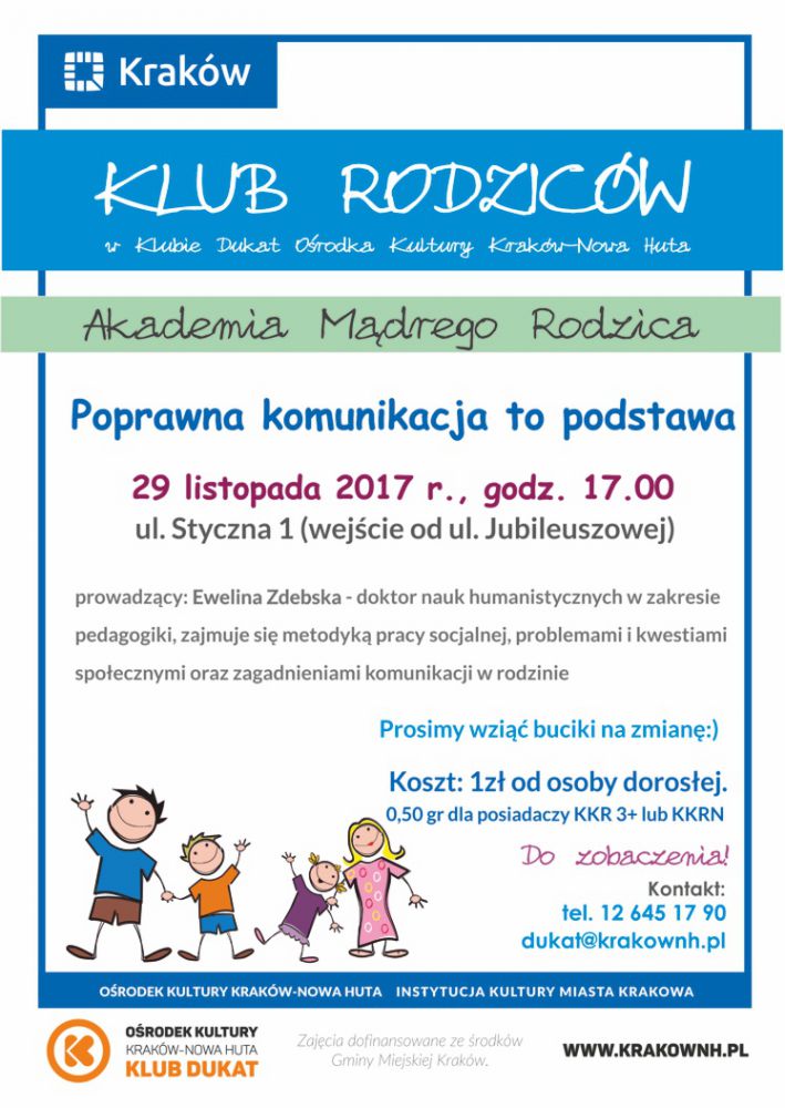 Klub Dukat Orodka Kultury Kraków-Nowa Huta (ul. Styczna 1) zaprasza w rodę 29 listopada w godz. 17.00-18.30 na warsztaty dla rodziców na temat komunikacji. Spotkanie poprowadzi Ewelina Zdebska - doktor nauk humanistycznych w zakresie pedagogiki, adiunkt pracownik naukowo-dydaktyczny Instytutu Pracy Socjalnej Uniwersytetu Pedagogicznego w Krakowie. Zajmuje się metodykš pracy socjalnej, problemami i kwestiami społecznymi, instytucjami wsparcia społecznego oraz zagadnieniami komunikacji w rodzinie.