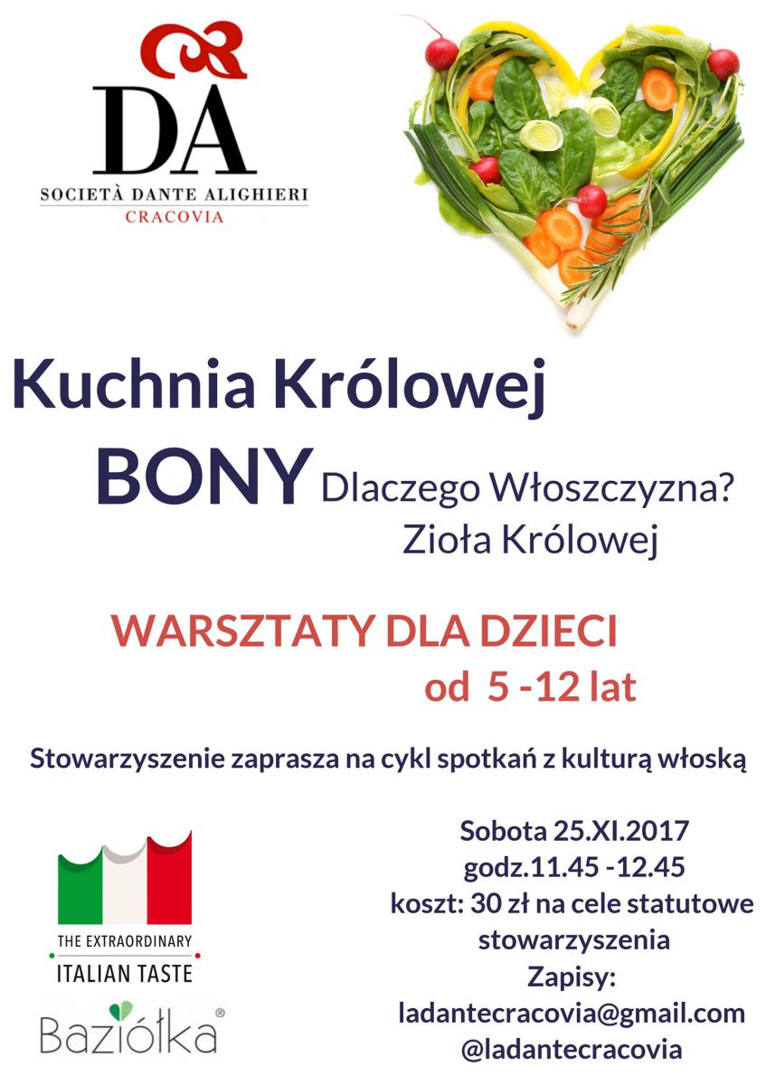 25 listopada w sobotę o godz. 11.45 zapraszamy dzieci w wieku od 5 do 12 lat na warsztaty pt: “Kuchnia Królowej Bony”,podczas których poznamy włoskš królowš, poczujemy zapach włoskich ziół,dowiemy się ja nazywajš się poszczególne warzywa w języku włoskim. Odpowiemy na pytanie dlaczego włoszczyzna.
