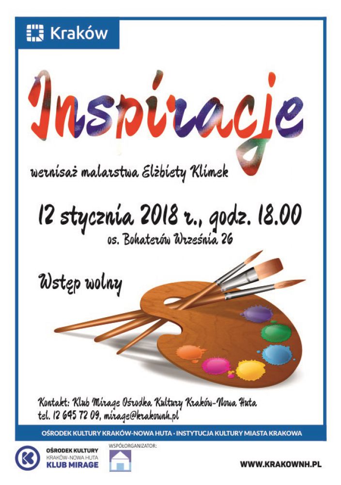 Klub Mirage zaprasza na wernisaż wystawy malarstwa Elżbiety Klimek. Artystka jest członkiem Stowarzyszenia Plastyków Ziemi Krakowskiej. Malowanie to jej wielka pasja i sposób na życie. Maluje głównie technikš olejnš, ale lubi także pastele, węgiel, akwarele i ołówek. Inspiracjš do malowania jest œwiat natury, architektura, zwierzęta oraz portret. Interesuje się również liternictwem, głównie kaligrafiš. Uczestniczyła w wielu wystawach zbiorowych w Krakowie i okolicach, jej prace znajdujš się w domach w kraju i za granicš. Wernisaż uœwietni koncert gitarowy Piotra Pitali.
