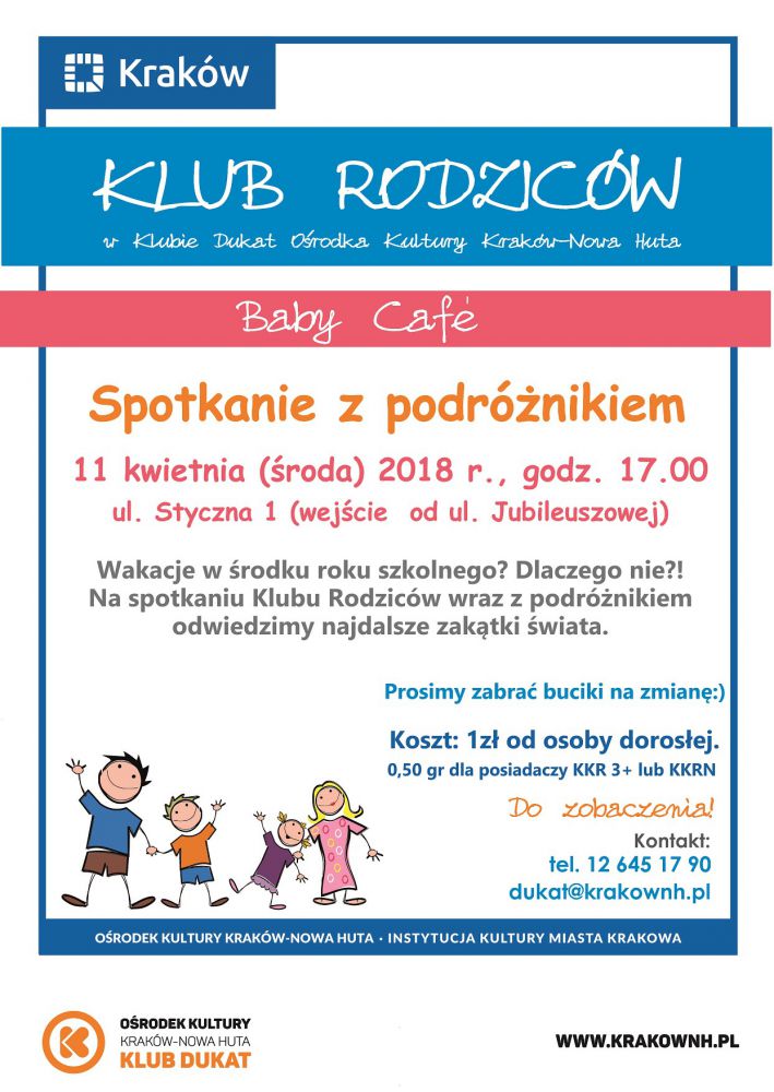 Klub Dukat Orodka Kultury Kraków-Nowa Huta (ul. Styczna 1) zaprasza 11 kwietnia w godz. 17.00-18.30 na Spotkanie z podróżnikiem, podczas którego posłuchamy o zakštkach wiata, do których docierajš tylko najwytrwalsi. Goci kolejnej edycji Baby Cafe nie interesujš wycieczki w stylu all inclusive. Para podróżników mówi o sobie: "Staramy się unikać utartych szlaków i metropolii, cišgnie nas do natury. Dzielimy się swoimi przygodami, wskazówkami i dobrymi radami - co, gdzie i jak. W oczekiwaniu na czas letniego odpoczynku warto już teraz posłuchać o odległych krainach i poszukać inspiracji przed planowaniem własnych wakacyjnych wojaży.