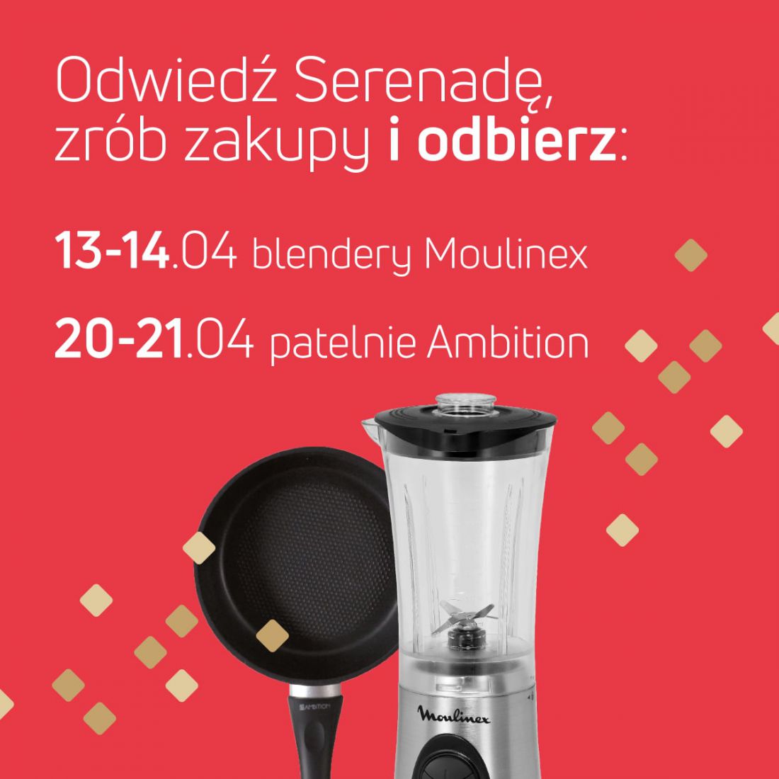 Już 13 i 14 kwietnia robišc zakupy w Centrum Serenada o równowartoci 500 zł, można otrzymać blender firmy Moulinex. Aby otrzymać nagrodę, wystarczy okazać paragony w punkcie odbioru. Paragony można ze sobš łšczyć, lecz ich liczba nie może być większa niż trzy.