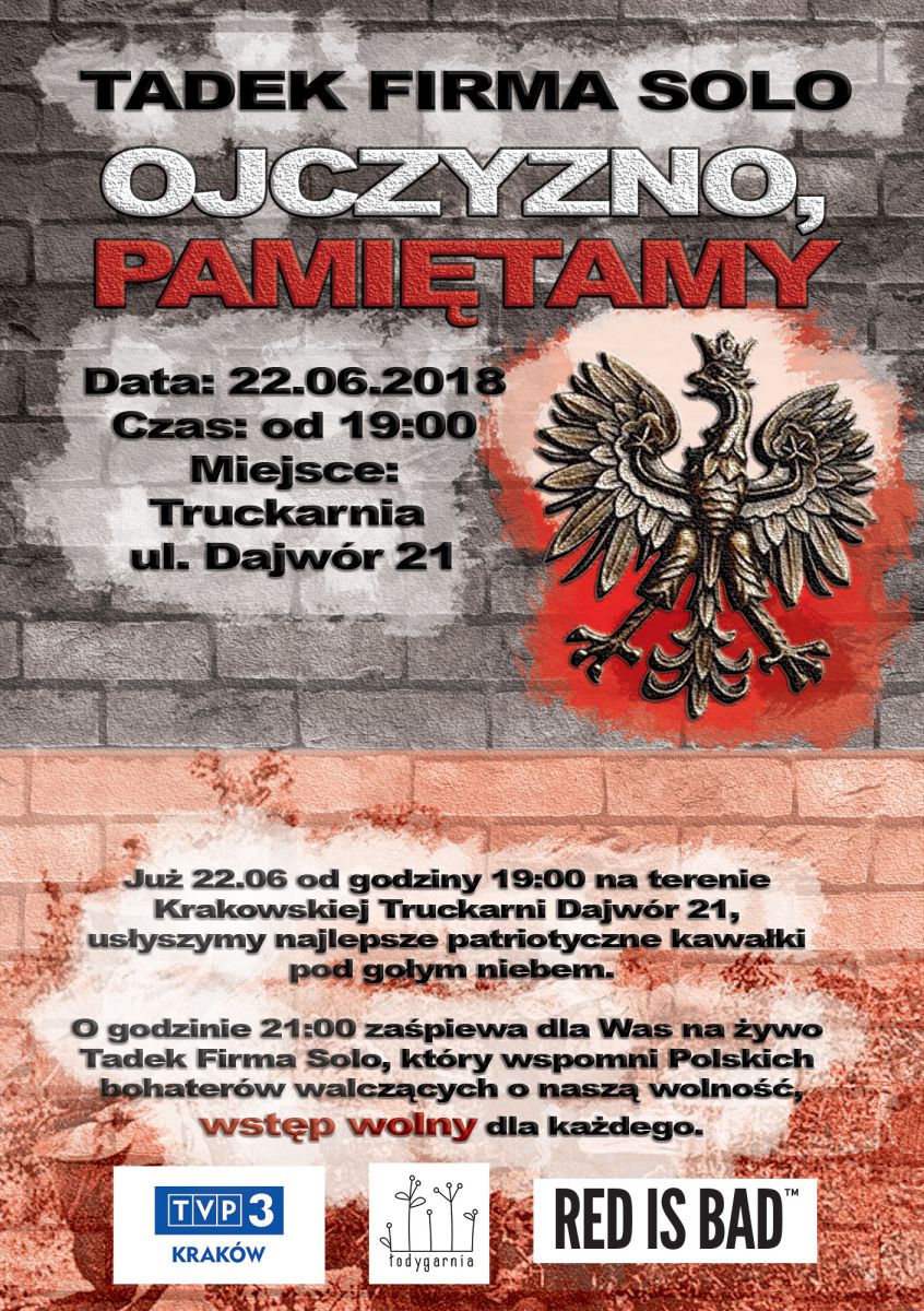 W pištek, 22 czerwca, na krakowskim Kazimierzu odbędzie się wyjštkowy patriotyczny koncert. Tadek, jeden z dwóch czołowych członków legendarnej grupy hip-hopowej Firma, zaprezentuje swój solowy repertuar podczas koncertu Ojczyzno Pamiętamy.