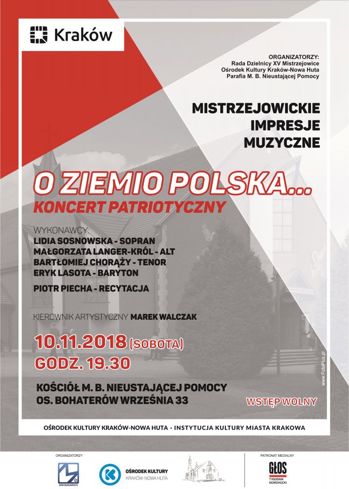 Na koncert zapraszajš organizatorzy cyklu Mistrzejowickie Impresje Muzyczne: Rada i Zarzšd Dzielnicy XV Mistrzejowice, Orodek Kultury Kraków-Nowa Huta oraz Parafia Matki Bożej Nieustajšcej Pomocy.
