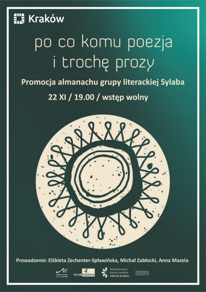 Spotkanie promujšce Almanach "Po co komu poezja i trochę prozy" wydany przez Stowarzyszenie Pisarzy Polskich Oddział Kraków. Prowadzenie: Elżbieta Zechenter-Spławińska, Michał Zabłocki i Anna Mazela. Wstęp wolny.