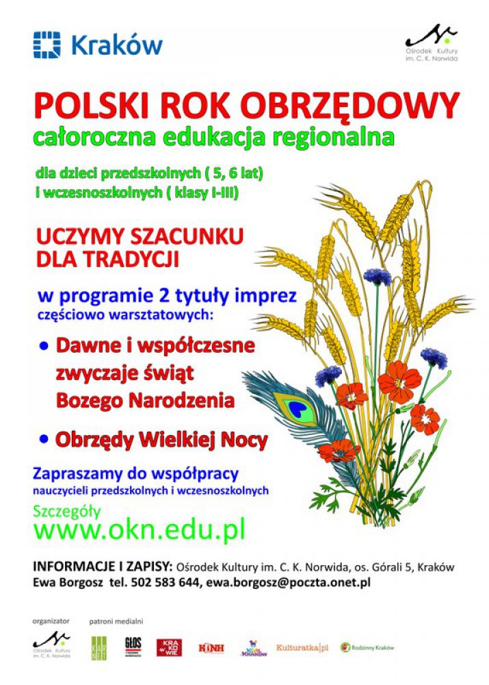 Podczas imprez opowiemy i porozmawiamy z dziećmi o cudownych obrzędach, tradycjach i zwyczajach okresu Bożego Narodzenia w tym o chodzeniu po kolędzie, kolędowaniu i kolędnikach. Wspólnie zapiewamy kolędy. Ubierzemy dawnš i współczesnš choinkę. We wspaniałych, tradycyjnych strojach wystšpi najlepsza w Małopolsce grupa kolędnicza HERODY z Zielonek, wielokrotni zdobywcy Złotych spinek podczas Festiwalu w Bukowinie Tatrzańskiej. Dzieci wezmš udział w okolędowaniu. Złożymy tradycyjne życzenia noworoczne, sypišc owsem na obfitoć. Na koniec spotkań grupy będš mogły zrobić sobie zdjęcie z Herodami ( proszę przynieć własne aparaty lub komórki). To już ostatnie spotkania w Orodku Kultury Norwida z cyklu Polski Rok Obrzędowy dlatego tym bardziej zachęcamy do udziału przeszkola i szkoły!