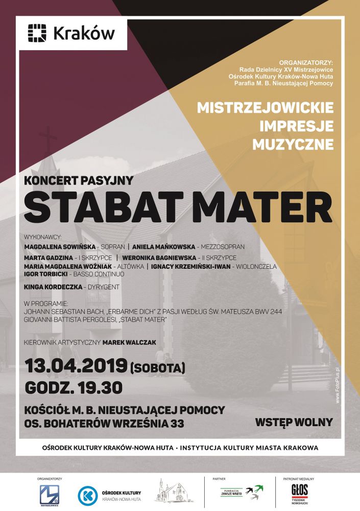 Koncert Pasyjny zatytułowany Stabat Mater odbędzie się w ramach cyklu Mistrzejowickie Impresje Muzyczne w sobotę 13 kwietnia o godzinie 19.30 w kociele Matki Bożej Nieustajšcej Pomocy na os. Bohaterów Wrzenia 33. Wykonawcami będš studenci akademii muzycznych w Poznaniu i Gdańsku oraz absolwenci krakowskich szkół muzycznych: Magdalena Sowińska sopran, Aniela Mańkowska mezzosopran, Marta Gadzina - I skrzypce, Weronika Bagniewska II skrzypce, Maria Magdalena Wożniak altówka, Ignacy Krzemiński-Iwan wiolonczela, Igor Torbicki - basso continuo pod dyrekcjš Kingi Kordeczka.