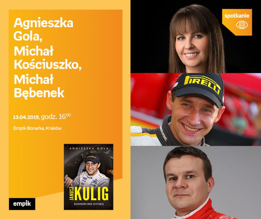Agnieszka Gola w ksišżce Niedokończona historia. Janusz Kulig (Burda Ksišżki) postanowiła zebrać wszystkie dotšd nieopublikowane wspomnienia o jednym z najbardziej utytułowanych polskich kierowców rajdowych. To rozmowy z ludmi, którzy byli najbliżej: rodzina, przyjaciele, team sportowy, kierowcy i piloci rajdowi. Wród nich Sobiesław Zasada, Leszek Kuzaj, Maciej Wisławski, Michał Kociuszko i jeden z największych rywali Janusza Krzysztof Hołowczyc. Jaki prywatnie był Janusz Kulig? Skšd wzięła się ksywka Rysopis? Co działo się za kulisami największych rajdów? Jakie sposoby miał Kulig na swoich rywali? Tego wszystkiego dowiecie się z ksišżki oraz podczas spotkania.