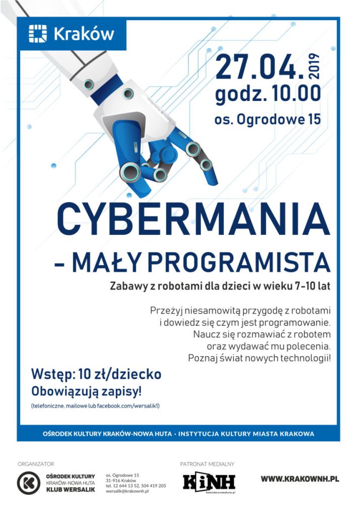 Klub Wersalik Orodka Kultury Kraków-Nowa Huta (os. Ogrodowe 15) zaprasza 27 kwietnia o godz. 10.00 na Cybermanie dla małych programistów. Przeżyj niesamowitš przygodę z photonami i dowiedz się czym jest programowanie. Nauczymy Cię jak rozmawiać z Robotem oraz wydawać mu polecenia. Będziesz miał okazję sterować robotem i wyznaczać trasę, którš photon będzie miał za zadanie pokonać. Być może programowanie zainteresuje Cię na tyle, aby zgłębiać jego tajniki i zostać w przyszłoci programistš? Przyjd i zobacz wiat nowych technologii. Jeli masz od 7 do 10 lat to nie może Cię u nas zabraknšć! NA WYDARZENIE WYMAGANE SĽ WCZENIEJSZE ZAPISY (telefonicznie, mailowo lub przez Facebooka)