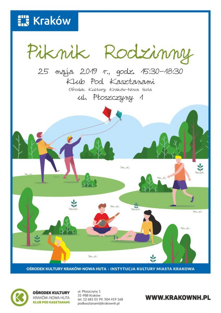 Klub Pod Kasztanami Oœrodka Kultury Kraków-Nowa Huta (ul. Płoszczyny 1) zaprasza 25.05 w godz. 12.00-16.00 na rodzinny piknik w – miejmy nadzieję – pięknš majowš sobotę. To czas na zacieœnienie więzi sšsiedzkich oraz rodzinnych, spotkania ze znajomymi, odpoczynek i zabawę w wielopokoleniowym gronie.