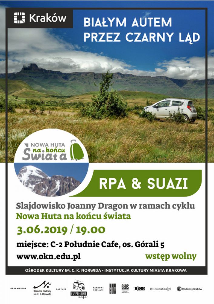 Tym razem przeniesiemy się na samo południe Afryki. O swojej trzytygodniowej podróży po RPA i Królestwie Suazi opowie Joanna Dragon. Oprócz obejrzenia cudownych zdjęć i filmików, będzie można posłuchać wielu ciekawych historii m.in. o bliskich spotkaniach na drodze ze słoniami i nosorożcami, problemach kierowców w Suazi, noclegach "na dziko", gdzie odbywa się i z czym jest zwišzany taniec dziewic, co można zobaczyć w Parku Narodowym Krugera oraz jak wyglšda życie w tych krajach.