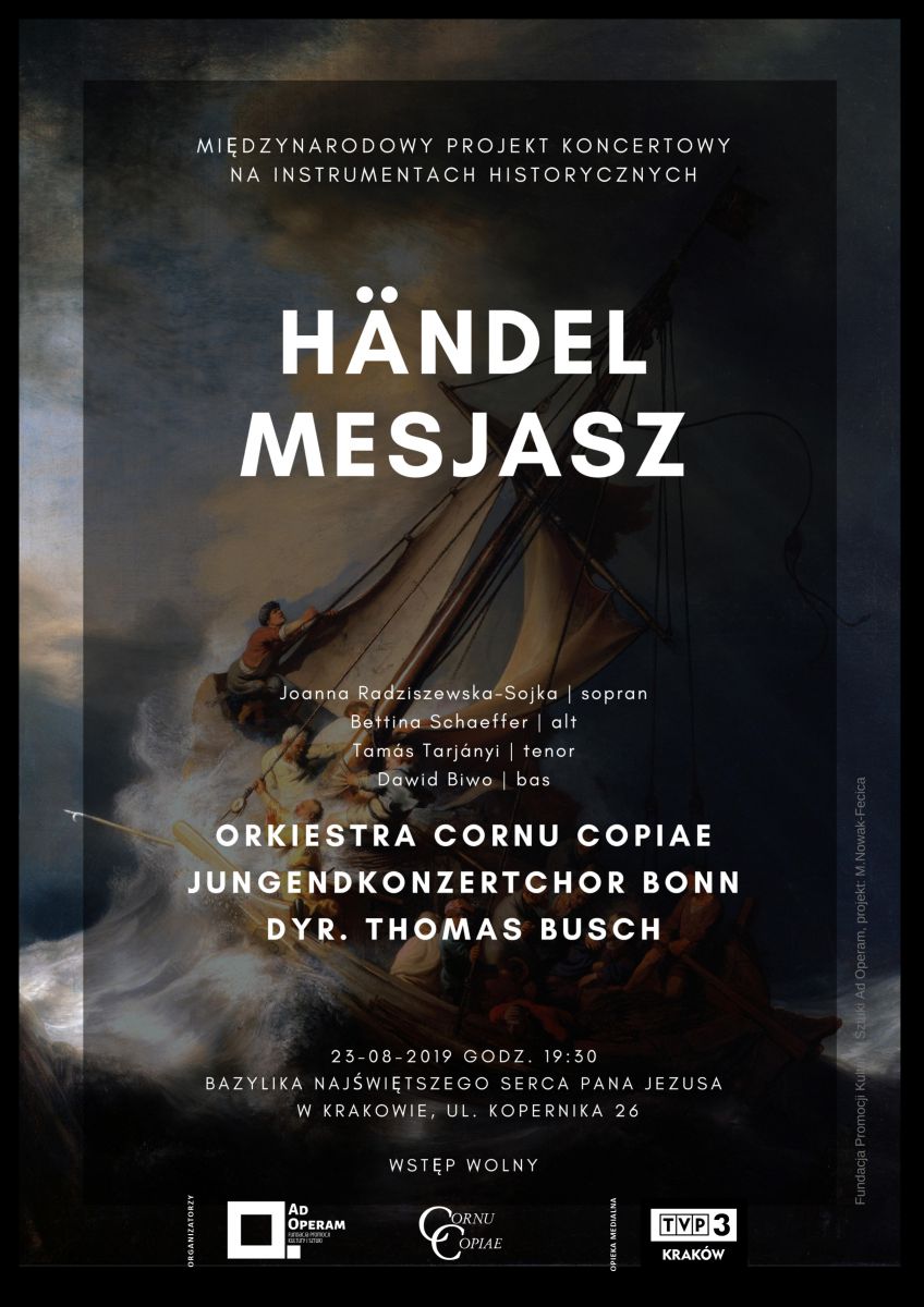 23.08.2019 r. o godz. 19:30 w Bazylice Najświętszego Serca Pana Jezusa w Krakowie przy ulicy Kopernika 26 odbędzie się w ramach współpracy pierwszy koncert wielkiego dzieła światowego mistrza baroku Georga Friedricha Händla – oratorium „Mesjasz”.