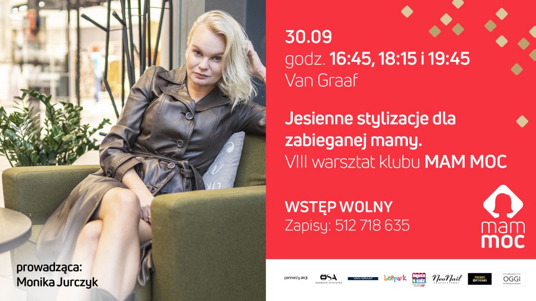 Chłody jesieni rozgrzewamy zapałem i kobiecš solidarnociš! To znak, że spotkania z cyklu MAM MOC wracajš do Centrum Serenada. Już 30 wrzenia odbędzie się ich kolejna odsłona. Z mylš o wszystkich mamach przygotowalimy warsztaty pt. Jesienne stylizacje dla zabieganej mamy", które poprowadzi OSA Osobista Stylistka. Warsztaty odbędš się w trzech grupach o 16.45, 18.15 oraz 19.45.