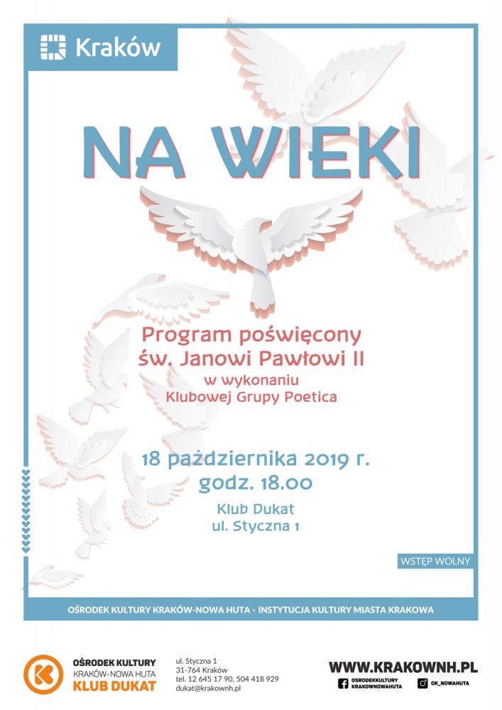Co roku w październiku obchodzony jest Dzień Papieski. Z tej okazji Klubowa Grupa Poetica zaprasza na program poetycki przy akompaniamencie Bartosza Cieśniarskiego, dla upamiętnienia 14. rocznicy śmierci Jana Pawła II. Atmosfera ostatnich chwil życia papieża, emocje i słowa, jakie na zawsze zapamiętali zebrani przy nim wieloletni współpracownicy, staną się punktem wyjścia do poetyckich rozważań na temat znaczenia śmierci, stosunku do jej dyskretnej, lecz stałej obecności przez całe życie i sposobu przeżywania odchodzenia znajomych, najbliższych, a na koniec – nas samych.