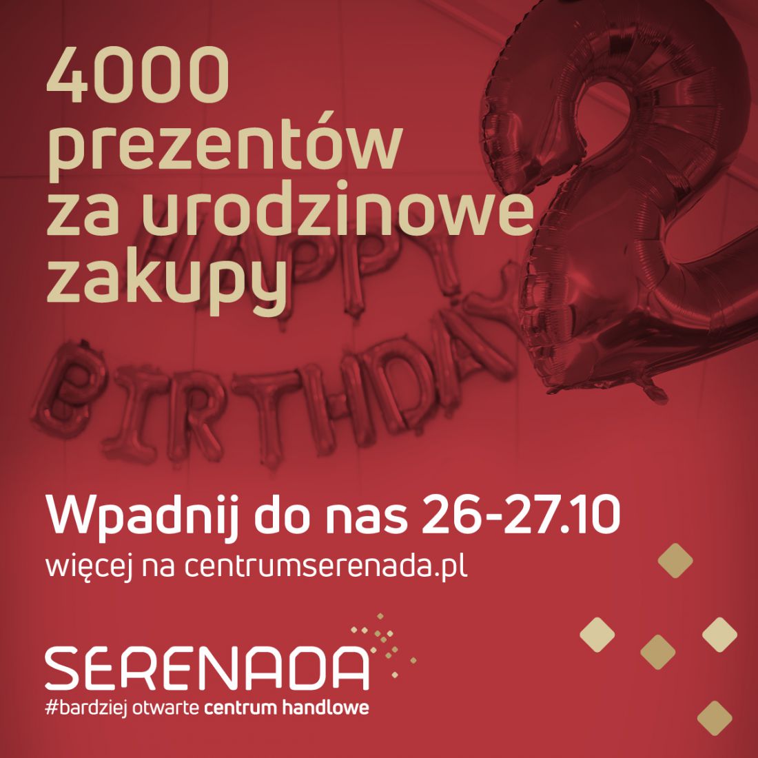 Przed nami dwa wyjątkowe dni pełne emocji – 26 i 27 października świętujemy drugie urodziny Centrum Serenada! Oprócz licznych atrakcji, porywającej muzyki i animacji dla dzieci, na klientów czeka specjalna akcja promocyjna, w której do rozdania jest aż 4000 praktycznych prezentów.