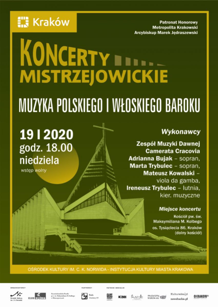 Już w niedzielę (19.01.2020 r.) zapraszamy do kościoła pw. św. M. M. Kolbego, na os. Tysiąclecia 86 na koncert w wykonaniu Zespołu Muzyki Dawnej Camerata Cracovia. Wstęp wolny.