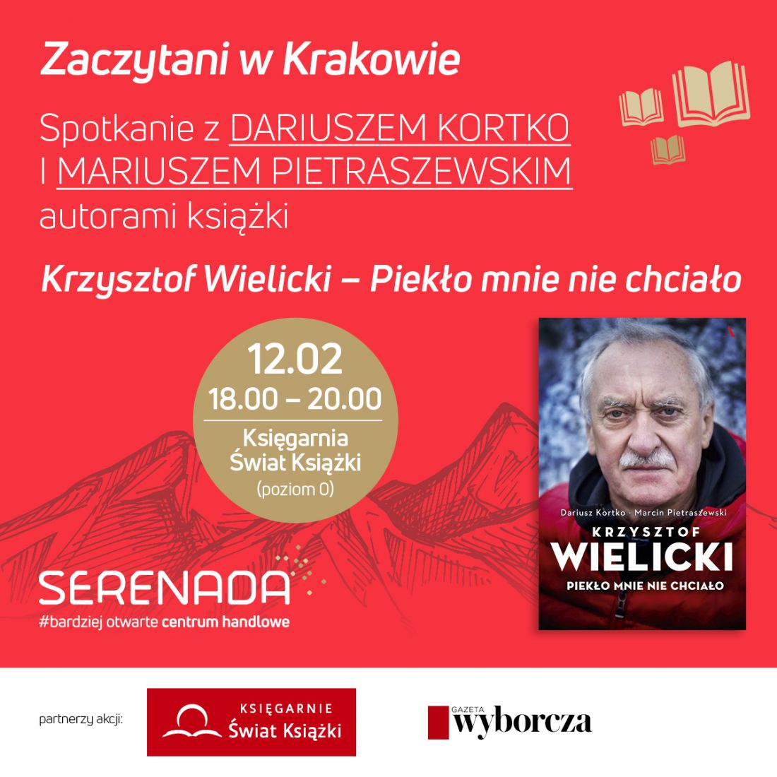 Świetne książki i utalentowani pisarze – tak zapowiada się nowy cykl spotkań autorskich „Zaczytani w Krakowie”, który będzie odbywał się w Centrum Serenada. Pierwsze spotkanie z Dariuszem Kortko i Mariuszem Pietraszewskim, autorami książki „Krzysztof Wielicki – Piekło mnie nie chciało”, już 12 lutego o godzinie 18.00 w księgarni Świat Książki w Serenadzie.