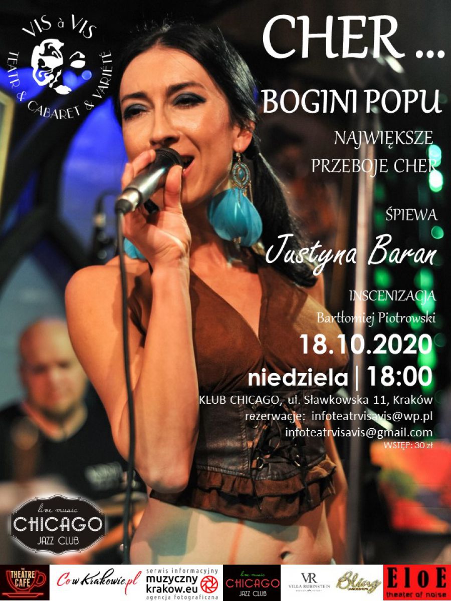 Podczas koncertu największe przeboje CHER – BOGINI POPU zaśpiewa dla Państwa artystka Teatru VIS A VIS – aktorka i wokalistka obdarzona niezwykłym głosem oraz ogromnym temperamentem scenicznym JUSTYNA BARAN.