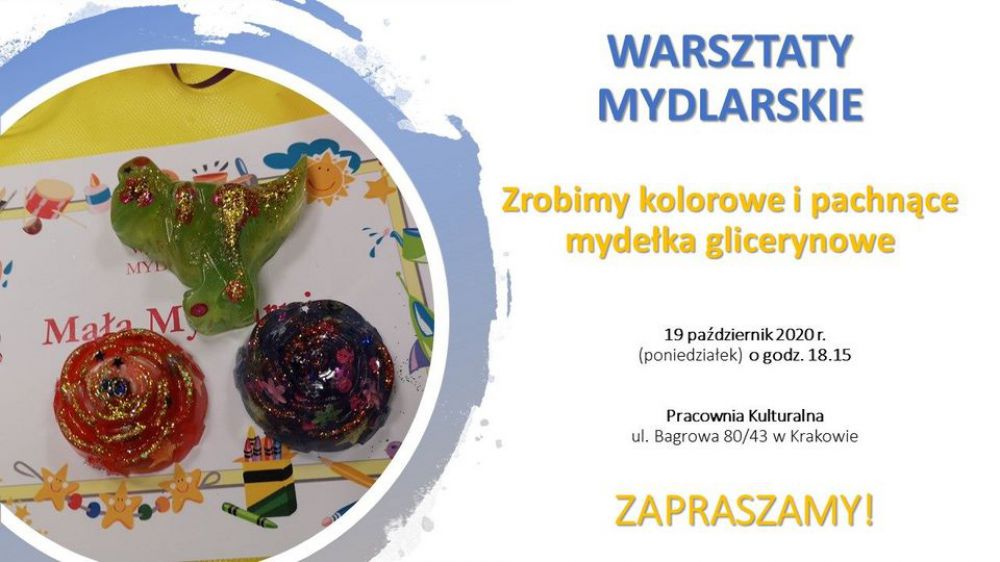 KOSZT: 35 zł uczestnik (w cenie 1 mydełko, opakowanie, barwnik, aromaty, dodatki, dodatkowe mydełko 10 zł)