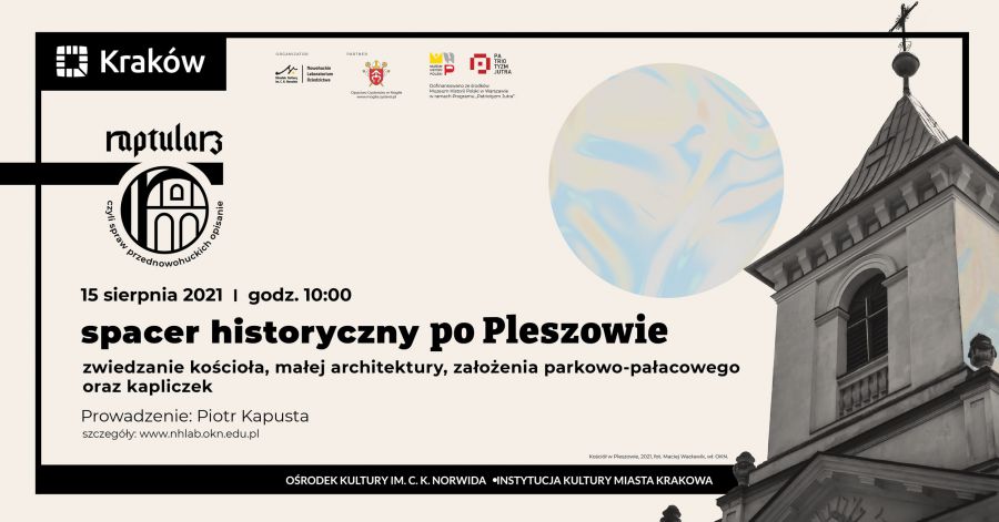 Podczas spaceru uczestnicy zwiedzš cmentarz, kociół małej architektury, założenia parkowo-pałacowe oraz kapliczki. Ponadto omówiony zostanie dawny układ urbanistyczny Pleszowa. Podczas spaceru usłyszymy także historię pobytu Tadeusza Kociuszki w Pleszowie w 1794 r. oraz przyjrzymy się lokalnym formom upamiętnienia tego wydarzenia.