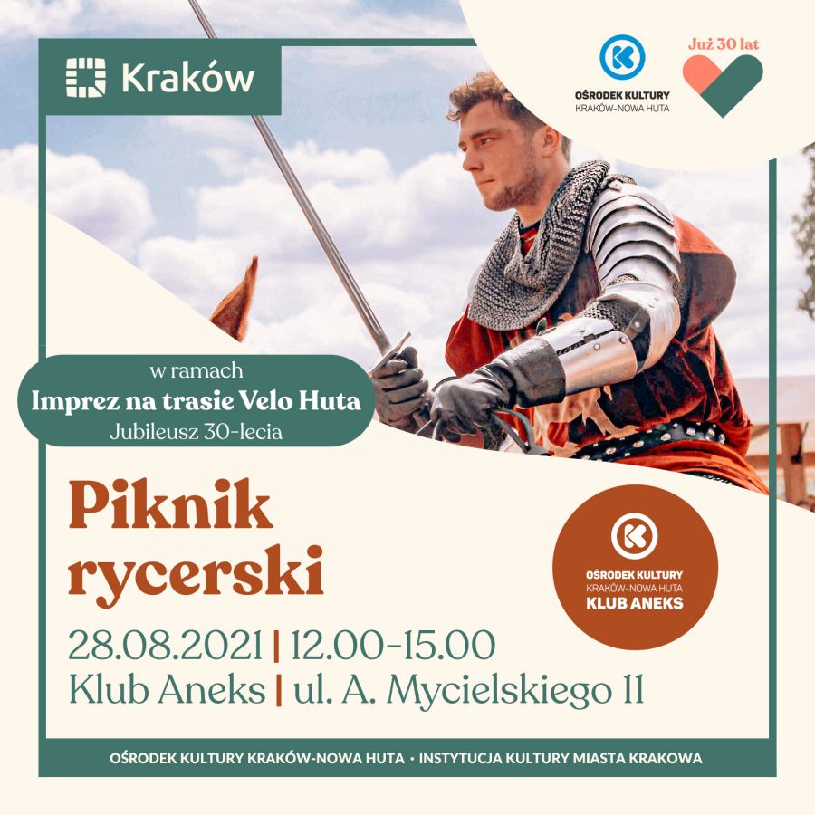 W ramach obchodów 30-lecia Orodka Kultury Kraków-Nowa Huta Klub Aneks (ul. A. Mycielskiego 11) zabierze nas w podróż w czasie. W sobotę 28 sierpnia w godz. 12.00-15.00 przeniesiemy się do wioski rycerskiej, gdzie poznamy obowišzki rycerskie, obejrzymy pokazy walk rycerskich i tańców dworskich, wemiemy udział w konkursowych rywalizacjach np. strzelaniu z łuku i dowiemy się jakie były zabawy plebejskie. Wydarzenie organizowane jest w ramach cyklu Imprezy na trasie, realizowanego w ramach jubileuszu 30-lecia Orodka Kultury Kraków-Nowa Huta.