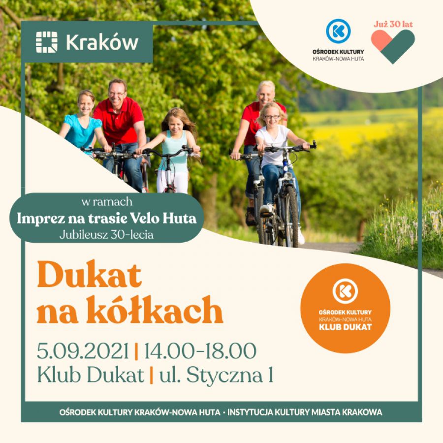 więtujemy na okršgło to hasło obchodów 30-lecia Orodka Kultury Kraków-Nowa Huta. I na okršgło - bo na kółkach - więtować będziemy także podczas jednej z Imprez na trasie jubileuszowego szlaku Velo Huta - w Klubie Dukat (ul. Styczna 1). Instruktorki Klubu zapraszajš w niedzielę 5 wrzenia w godz. 14.00-18.00 na wspólny, aktywny czas, a w nim: Gimnastyka w kółko z fizjoterapeutkš Elš i zestawy ćwiczeń wzmacniajšcych dla cyklistów, Rowerowy zawrót głowy - czyli wspólny przejazd na dwóch kółkach wokół Klubu Dukat, tor przeszkód do pokonania jednoladem, Rowerowe potyczki rodzinne - czyli rodzinne konkursy w temacie rowerowym, męska konkurencja - Sztafeta na kółkach, a nawet Zumba z Martynš dla cyklistów! Tradycyjnie nie zabraknie także malowania buziek, skręcania balonów i puszczanie baniek mydlanych.