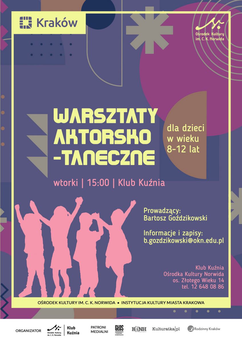 Warsztaty aktorsko-taneczne to zajęcia skierowane do dzieci w wieku 8-12 lat. Prowadzšcy: Bartosz Godzikowski aktor, tancerz, instruktor. Podczas zajęć uczestnicy będš poznawać podstawy gry aktorskiej, tańca klasycznego, współczesnego, jazz i modern.