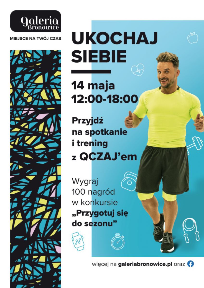 Moc, pozytywna energia oraz mnóstwo praktycznych wskazówek dotyczšcych tego, jak zadbać o zdrowie i figurę tego wszystkiego będzie można spodziewać się w sobotę, 14 maja, na spotkaniu z Qczajem w Galerii Bronowice. Wydarzenie pod szyldem Ukochaj siebie będzie okazjš, aby wzišć udział w treningu prowadzonym przez jednego z najbardziej rozpoznawalnych trenerów fitness, porozmawiać z nim o motywacji do działania, a także zrobić sobie wspólne pamištkowe zdjęcie.