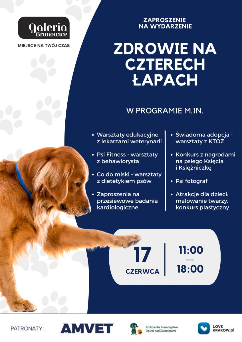 Już w najbliższą sobotę, 17 czerwca, w Galerii Bronowice właściciele i miłośnicy czworonogów będą mieli okazję wziąć udział w akcji „Zdrowie na czterech łapach”, organizowanej w ramach kampanii edukacyjnej Szpitala Weterynaryjnego AMVET. W programie wydarzenia znaleźć można m.in. warsztaty z zakresu weterynarii, dietetyki i behawiorystyki zwierząt, fitness dla pupili, atrakcje dla dzieci oraz konkursy z nagrodami.