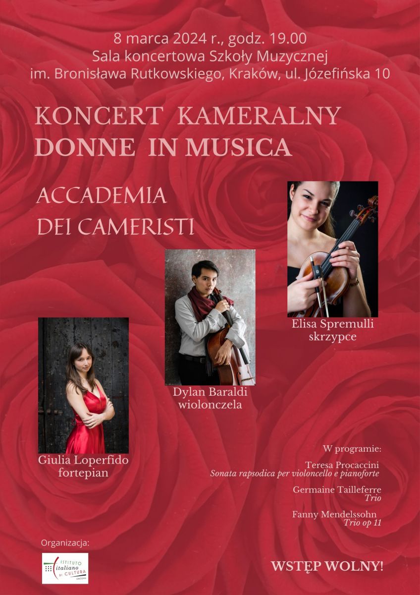 Włoski Instytut Kultury w Krakowie ma przyjemność zaprosić w Dniu Kobiet na specjalny koncert “Donne in musica” w wykonaniu włoskiego trio w składzie: