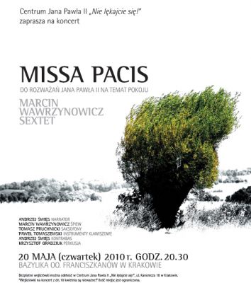 "MISSA PACIS (Msza Pokoju) jest niezwykłym i pierwszym w Polsce połšczeniem klasycznej formy muzycznej jakš jest Msza z liturgicznymi piewami w języku łacińskim, rozważaniami Jana Pawła II na temat pokoju oraz muzykš o mocnym zabarwieniu jazzowym.