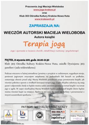 Podczas wieczoru Maciej Wielobb przedstawi etapy powstania swojej ksiki Terapia jog Joga i ajurweda w leczeniu chorb, rehabilitacji ruchowej i psychoterapii. Opowie take o rdach koncepcji terapii jog.