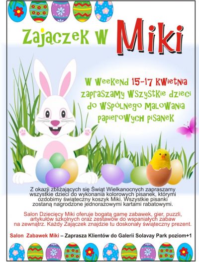 Salon zabawek Miki w Galerii Handlowej Solvay Park zaprasza najmłodszych milusińskich do wspólnej przedœwištecznej zabawy. W najbliższy weekend, 16-17 kwietnia, własnoręcznie wykonanymi pisankami ozdobimy œwišteczny koszyk Miki.