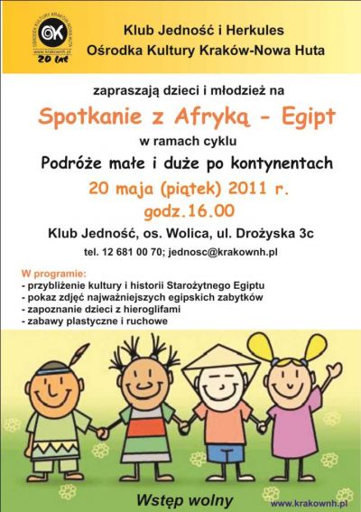 Spotkanie z Afrykš to pierwsze spotkanie w ramach podróżniczego cyklu Podróże małe i duże po kontynentach, którego głównym celem jest przybliżenie dzieciom i młodzieży kultur poszczególnych krajów i kontynentów poprzez różnorodne działania plastyczne, muzyczne i teatralne. Na pierwszym spotkaniu uczestnicy poznajš historię i kulturę Egiptu, a także przekazane zostanš im podstawowe informacje dotyczšce tak zwanego Czarnego Lšdu.