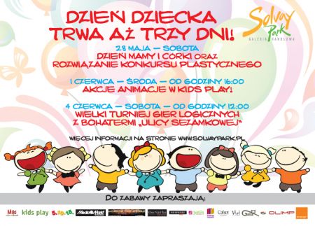 W Galerii Handlowej Solvay Park najmłodsi œwiętujš aż trzy dni! Bo kto powiedział, że Dzień Dziecka obchodzimy tylko 1 czerwca? Zaczynamy już w najbliższš sobotę, 28 maja atrakcjami dla mam i córek oraz rozwišzaniem konkursu plastycznego.