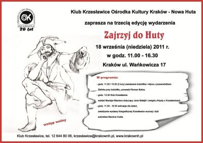 Klub Krzesławice Oœrodka Kultury Kraków-Nowa Huta(ul. Wańkowicza 17) zaprasza 18 wrzeœnia w godz. 11.00-16.30 do Krzesławic na trzeciš edycję projektu Zajrzyj do Huty, którego głównym organizatorem jest Muzeum Historyczne Miasta Krakowa. W programie imprezy: zwiedzanie koœciółka i młyna z przewodnikiem, wykład dotyczšcy Jana Matejki i zwišzku artysty z Krzesławicami, animacje dla dzieci, zwiedzanie wystawy fotograficznej Krzesławice wczoraj dziœ autorstwa Marcina Hueta.
